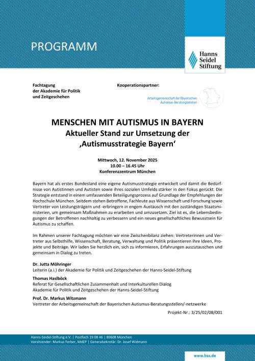 Wie wird die Autismusstrategie Bayern umgesetzt? Welche Fortschritte gibt es? Erfahren Sie es bei unserer Fachtagung "Menschen mit Autismus in Bayern", die wir gemeinsam mit der Hanns-Seidel-Stiftung und der Arbeitsgemeinschaft bayerischer Autismus-Beratungsstellen durchführen.